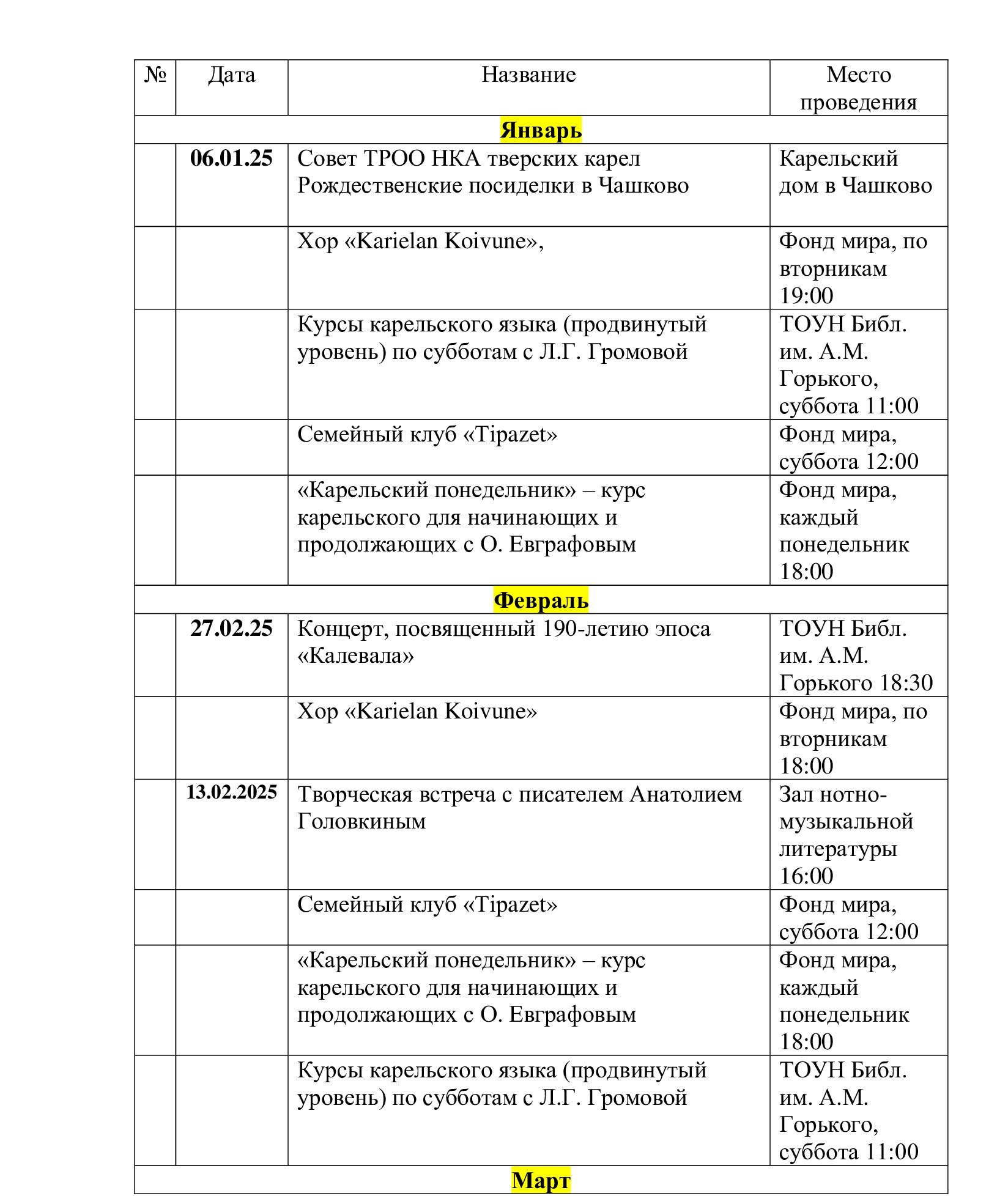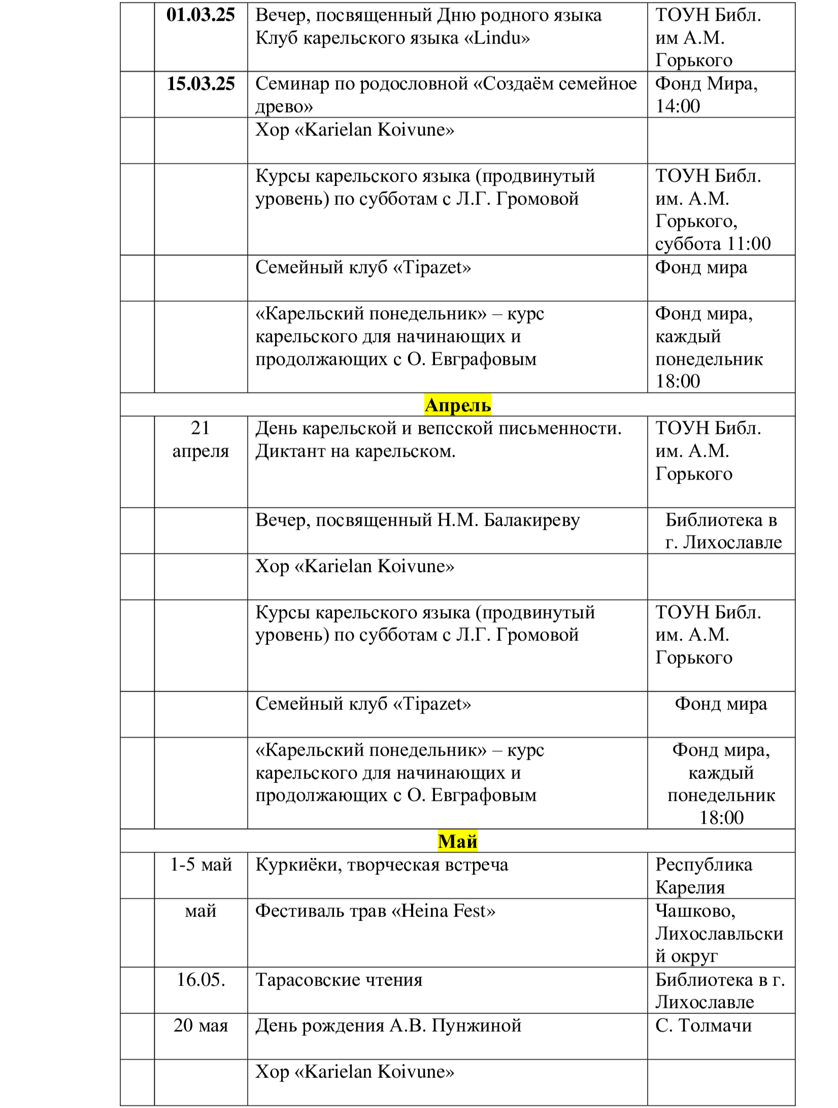 14. Организовать встречи участников курсов карельского языка со март-апрель